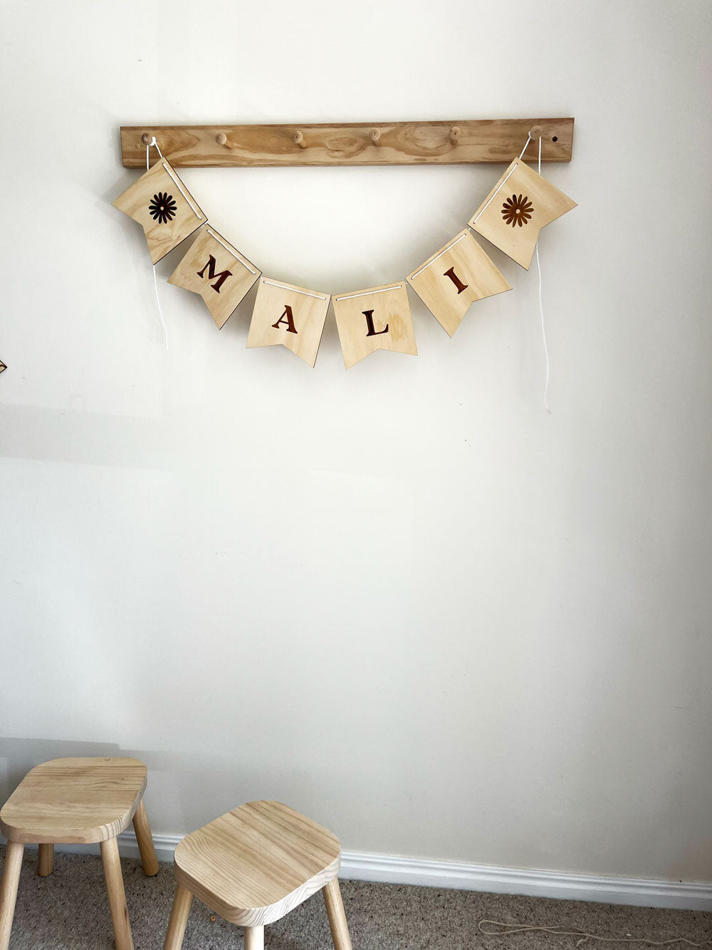 Create a truly unique and charming decoration for your little one’s space with our timber personalised letter bunting. Each piece is laser-cut from sustainably sourced timber and engraved with a single letter, allowing you to spell out names, words, or fun phrases that celebrate your child’s personality.